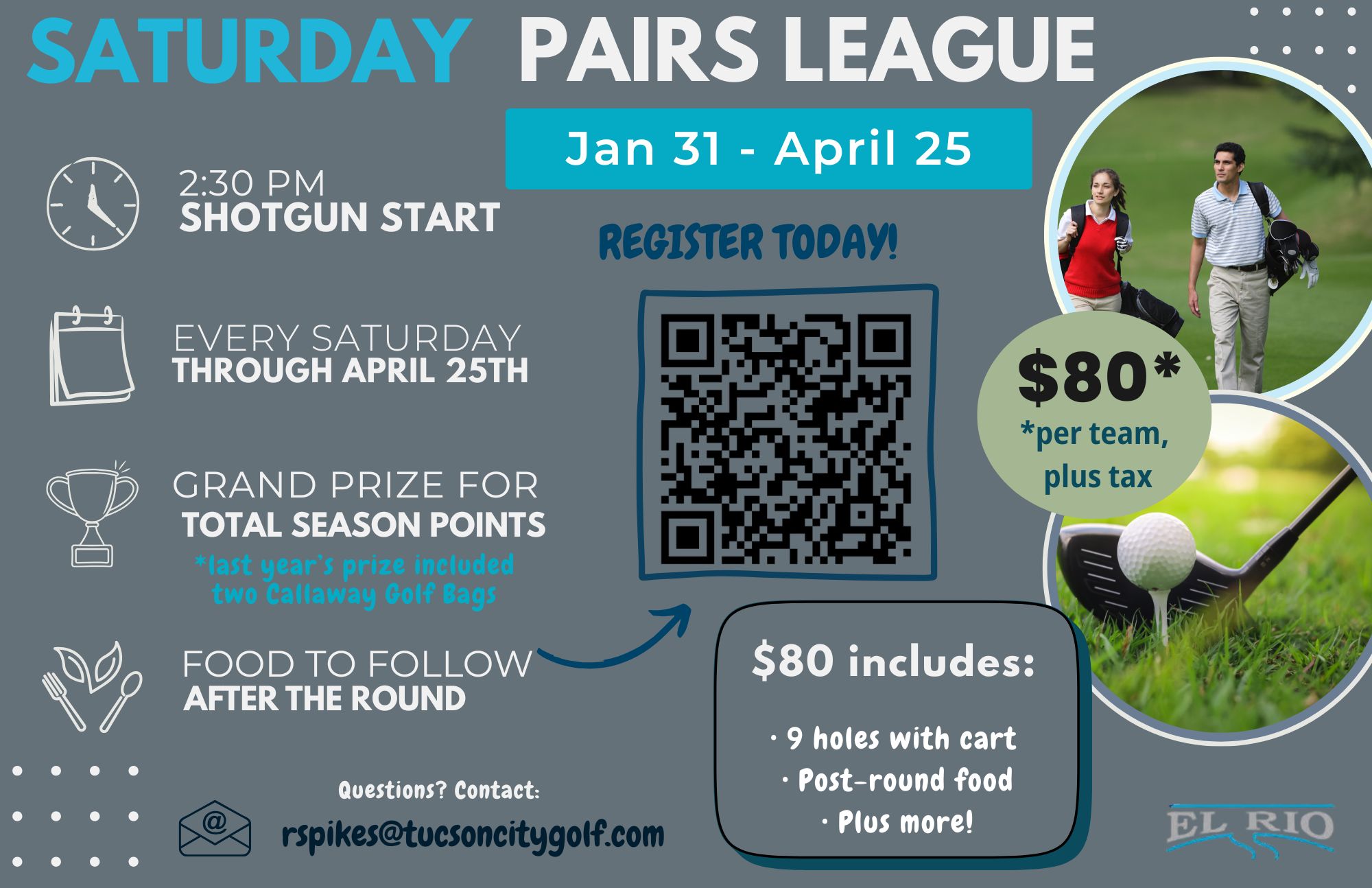 Our popular Saturday Pairs League is underway at El Rio Golf Course, and there’s still time to join the fun. Teams of two are competing each week in a relaxed, social 9 hole league running now through Saturday, April 25.Whether you’re teaming up with a friend, spouse, or your regular playing partner, this league is an easy way to enjoy weekly competition without the commitment of a full?day tournament. There will be a grand prize for total points scored through the season.